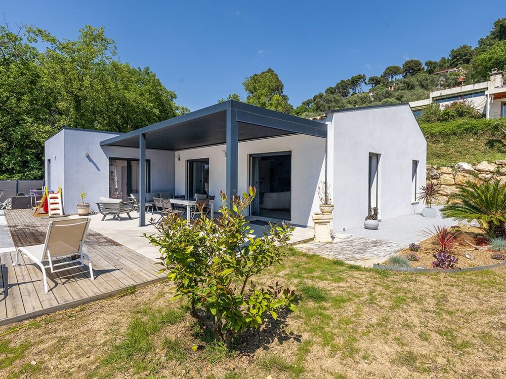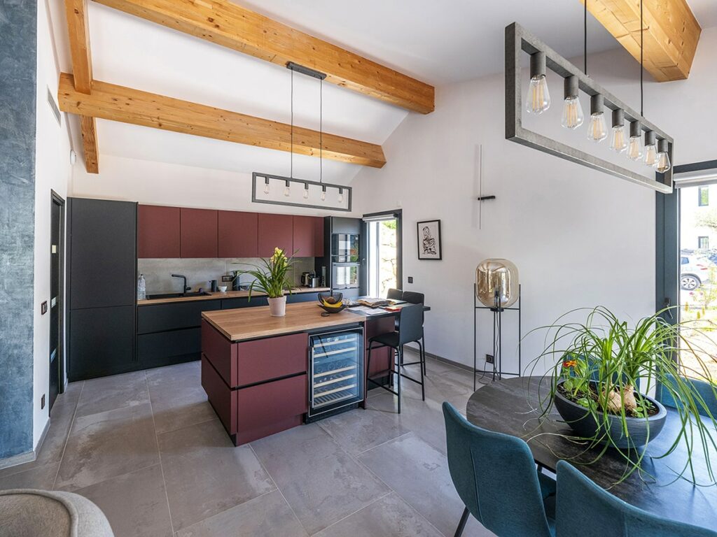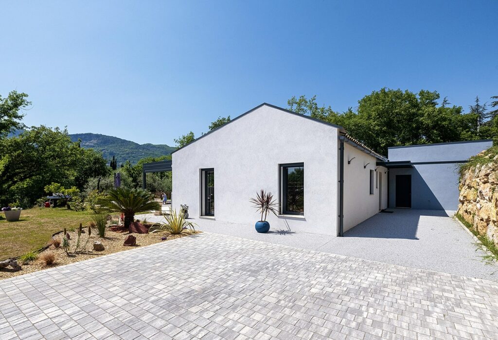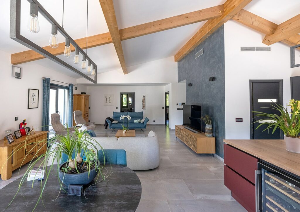 Le mur pignon surmonté d’une couvertine grise anthracite qui remonte au-dessus des tuiles, la toiture terrasse et la pergola participent à l’écriture contemporaine souhaitée par la MO. La présence de toiture en pente permet de dégager un volume généreux dans les pièces de vie.