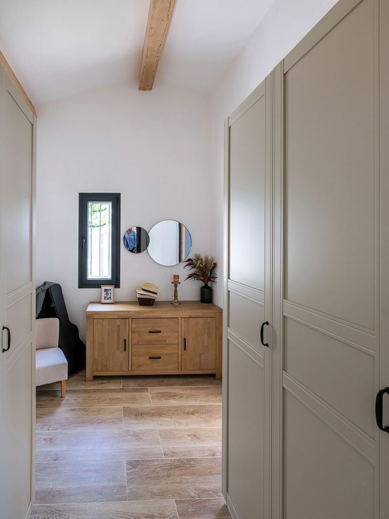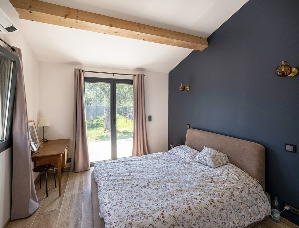 La 2nde maison se développe sur 2 niveaux. Un des enjeux a été de faire entrer le programme d’une suite parentale, 3 chambres, un grand séjour, un cellier dans une surface de 125 m². Il a notamment été souhaité par la MO, en cohérence avec le bureau d’étude thermique sur le confort d’été, d’installer des bras automatiques aux volets de la façade principale.