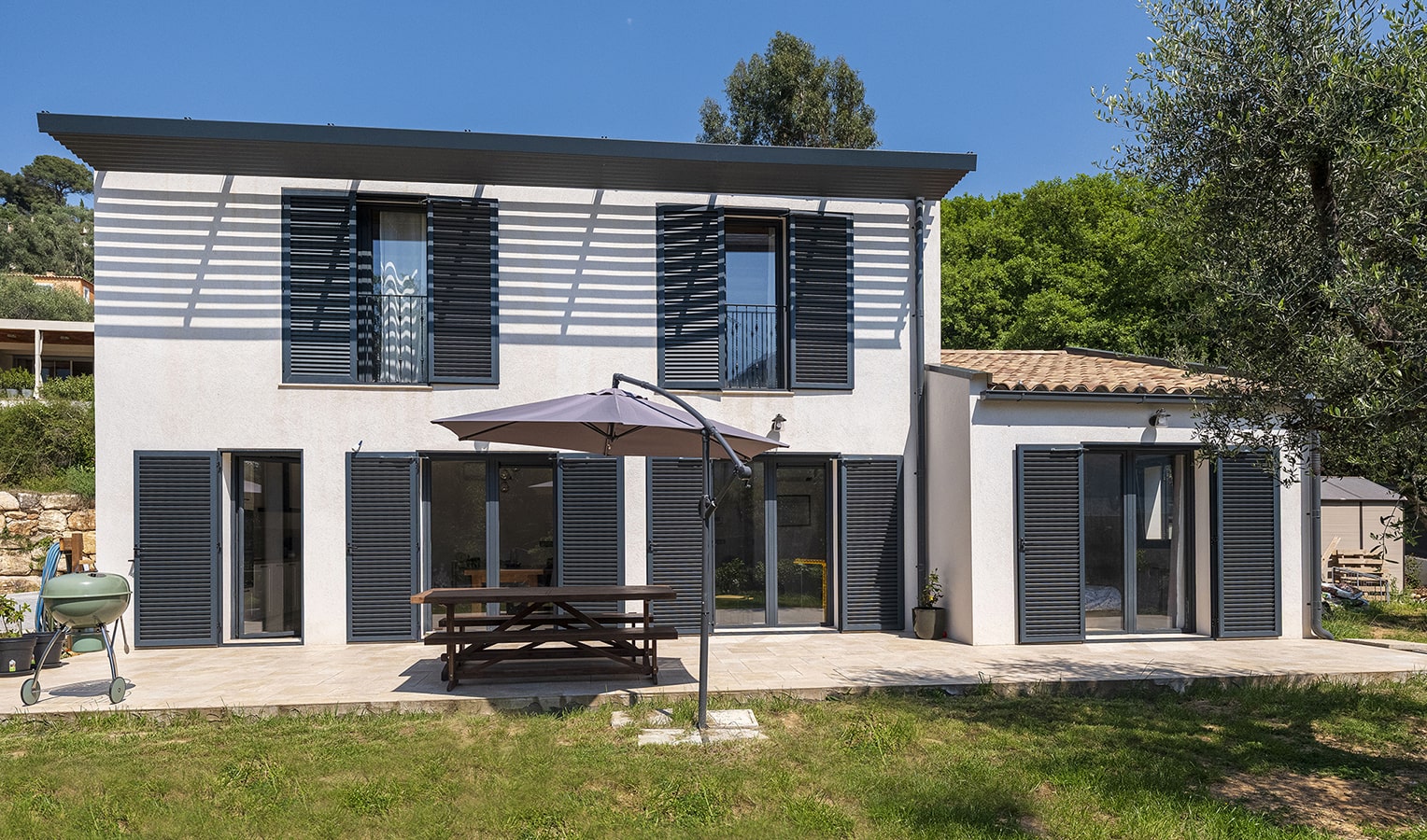La 2nde maison se développe sur 2 niveaux. Un des enjeux a été de faire entrer le programme d’une suite parentale, 3 chambres, un grand séjour, un cellier dans une surface de 125 m². Il a notamment été souhaité par la MO, en cohérence avec le bureau d’étude thermique sur le confort d’été, d’installer des bras automatiques aux volets de la façade principale.